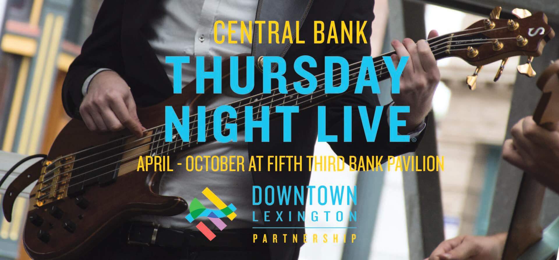 Join us in Downtown Lexington every Thursday evening, April 4 through October 10, for the 2019 Central Bank Thursday Night Live concert series! Come to Fifth Third Bank Pavilion from 5:00pm – 8:00pm for beverages, tasty food and of course, great music by live bands! Average nightly attendance is 2,000 with peak nights in May – July averaging 3,500.